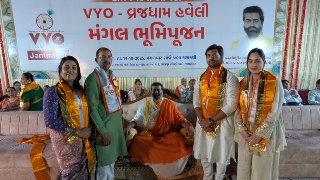જામનગર:”છોટી કાશી” તરીકે વિશ્વભરમાં ખ્યાતિ પામેલા જામનગરના ધાર્મિક અને સાંસ્કૃતિક ઇતિહાસમાં વધુ એક સુવર્ણ પૃષ્ઠનો ઉમેરો થયો છે. શહેરના વિકાસ પામી રહેલા લાલપુર રોડ પર, સહજાનંદ પાર્ક ખાતે, વૈષ્ણવ સંપ્રદાયનુ આસ્થાના કેન્દ્ર સમાન ‘શ્રી VYO વ્રજધામ હવેલી’ના નિર્માણ માટેનો મંગલમય પ્રારંભ થયો હતો. ગઈકાલે મંગળવારે સાંજે આયોજિત એક ભવ્ય અને દિવ્ય સમારોહમાં, પૂજ્યપાદ ગોસ્વામી શ્રી વ્રજરાજકુમારજી મહોદયના પાવન સાંનિધ્યમાં હજારો વૈષ્ણવોની ઉપસ્થિતિ વચ્ચે ભૂમિપૂજન વિધિ સંપન્ન કરવામાં આવી હતી.