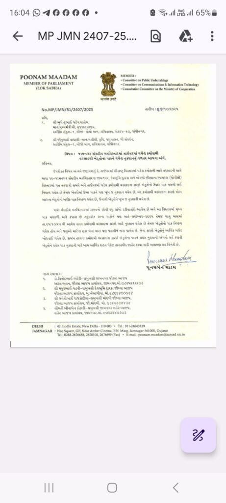 ગાંધીનગર ખાતે સચિવાલયના સ્વર્ણિમ સંકુલ-૧ માં મુખ્યમંત્રી અને કૃષિ મંત્રીના કાર્યાલયને પાઠવેલા પત્રમાં પૂનમબેન માડમે જણાવ્યું છે કે, સૌરાષ્ટ્ર વિસ્તારમાં તાજેતરમાં પડેલા ભારે કમોસમી વરસાદે તેમના ૧૨-જામનગર સંસદીય મતવિસ્તારમાં આવતા જામનગર, દેવભૂમિ દ્વારકા અને મોરબી જિલ્લાના આમરણ (ચોવીસી) વિસ્તારમાં ભારે તારાજી સર્જી છે. ખાસ કરીને સપ્ટેમ્બર-ઓક્ટોબર માસ દરમિયાન ગત નવરાત્રી સમયે અને તાજેતરમાં તારીખ ૨૫ ઓક્ટોબર, ૨૦૨૫ના રોજ ફરીથી ત્રાટકેલા આ માવઠાંના કારણે ખેડૂતોનો તૈયાર થયેલો ખરીફ પાક સંપૂર્ણપણે પલળી જઈ નિષ્ફળ ગયેલ છે તેમજ ખેતરોમાં ઉભા પાકને પણ ગંભીર નુકસાન પહોંચ્યું છે.