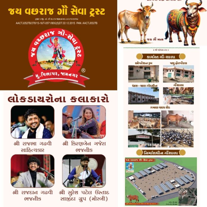 જામનગરના વિભાપર ગામે જય વછરાજ ગૌ સેવા ટ્રસ્ટ દ્વારા આવતીકાલેના રોજ ગૌધુલી મહાસંગ્રામ 2025નું ભવ્ય આયોજન કરવામાં આવ્યું છે. આ કાર્યક્રમનો મુખ્ય હેતુ ગૌ સેવા અને લોક જાગૃતિ ફેલાવવાનો છે, જેમાં મહાપ્રસાદ અને લોકડાયરાનું આયોજન કરવામાં આવ્યું છે. આ ગૌશાળામાં નિરાધાર, લુલી, લંગડી, અંધ-અપંગ, એકસીડન્ટ થયેલ 800થી વધુ ગાયોની સારવાર કરવામાં આવે છે. આ ગૌશાળાને જીવદયાના હેતુસર ધર્મપ્રેમી ભાઈ-બહેનોને તન-મન-ધનથી સહકાર આપવા અપીલ કરવામાં આવી છે.કાર્યક્રમની શરૂઆત આવતીકાલે સવારે 5:00 વાગ્યે પંચકુંડી યજ્ઞથી થશે, ત્યારબાદ બપોરે 3:00 વાગ્યે મહારાસનું આયોજન કરવામાં આવ્યું છે. સાંજે 5:00 વાગ્યે મહાપ્રસાદનું આયોજન કરવામાં આવ્યું છે.