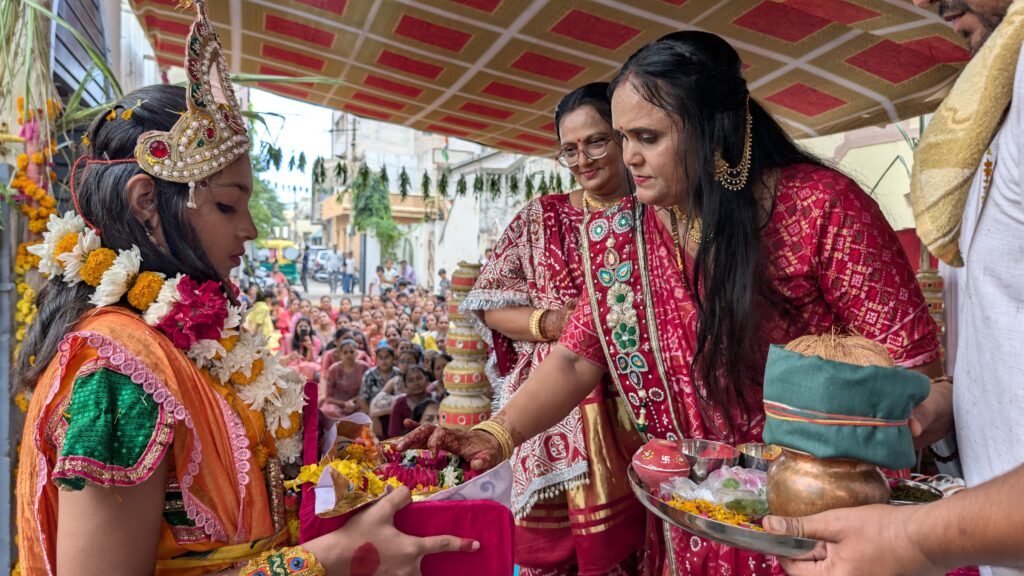 આ જાનમાં ‘માં દર્શન ગૌશાળા’ની બેન્ડ પાર્ટીએ ગીત-સંગીતની એવી સૂરાવલિઓ વહાવી હતી કે સમગ્ર વાતાવરણ ભક્તિમય બની ગયું હતું. ઠાકોરજીના આ દિવ્ય વરઘોડાથી પ્રભાવિત થઈ, શ્રદ્ધાળુ ભક્તોએ બેન્ડ પાર્ટી પર હજારો રૂપિયાના દાનનો રીતસર વરસાદ વરસાવ્યો હતો. જાન બપોરે આશરે ચારેક વાગ્યે હરિયા કોલેજ ખાતે આવી પહોંચી હતી, જ્યાંથી કન્યા પક્ષના નિવાસસ્થાન એવા કૈલાશ નગર સુધી ભવ્ય વરઘોડો કાઢવામાં આવ્યો હતો.