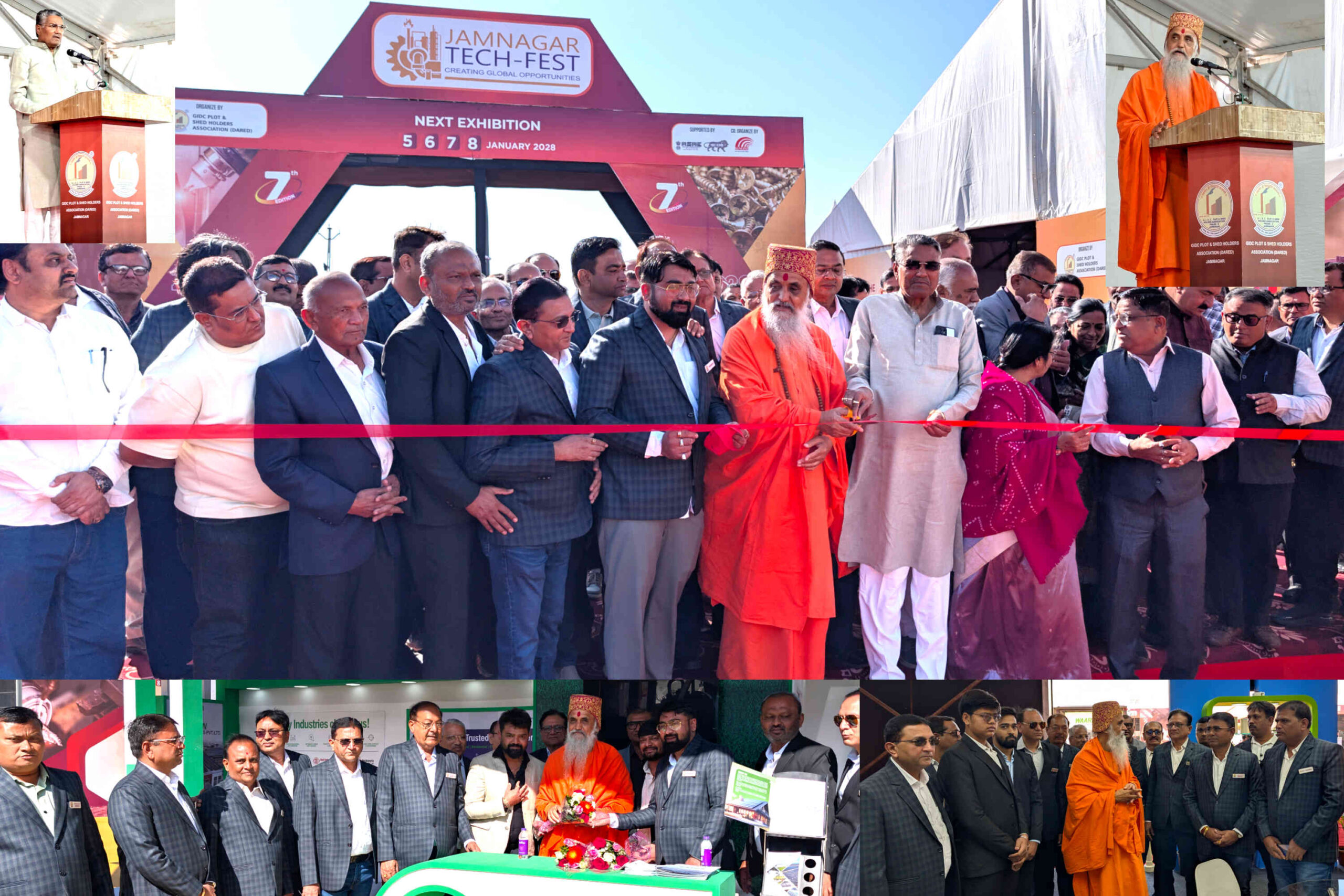 જામનગરના જી.આઈ.ડી.સી. વિસ્તારમાં આયોજિત આ મેગા ફેરના ઉદ્ઘાટન સમારોહમાં રાજકીય નેતાઓ, ઔદ્યોગિક સંગઠનોના હોદ્દેદારો અને ઉદ્યોગકારો મોટી સંખ્યામાં ઉમટી પડ્યા હતા, જેનાથી સમગ્ર વાતાવરણ ઉત્સાહ અને નવી આશાઓથી છવાઈ ગયું હતું.આ મેગા ઈવેન્ટનો વિધિવત પ્રારંભ શ્રી પ નવતન પુરીધામ ખીજડા મંદિર ટ્રસ્ટના મહંત અને પરમ પૂજ્ય આચાર્ય શ્રી કૃષ્ણમણીજી મહારાજના વરદ હસ્તે રીબીન કાપીને કરવામાં આવ્યો હતો, જે જામનગરના ઉદ્યોગો માટે આશીર્વાદ સમાન બની રહ્યું. રીબીન કટિંગ બાદ પૂજ્ય મહારાજશ્રી અને અન્ય મહાનુભાવોએ પ્રદર્શનમાં ઉભા કરાયેલા વિવિધ સ્ટોલ્સની રૂબરૂ મુલાકાત લીધી હતી અને ત્યાં પ્રદર્શિત કરાયેલી અદ્યતન મશીનરી તેમજ પ્રોડક્ટ્સ વિશે ઉંડાણપૂર્વક માહિતી મેળવી હતી.