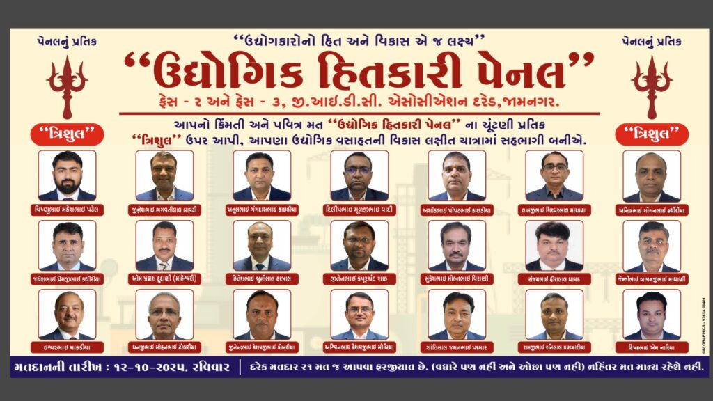 “નોટિફાઈડ એરિયા”ને બદલે ગુપ્ત MoU કરી ઉદ્યોગકારો પર ટેક્સ લાદ્યો; દિલ્હી સુધી લડત આપવાને બદલે ફાલતુ કામો ગણાવી ભોજન સમારંભોથી મતદારોને ભ્રમિત કરવાનો પ્રયાસ, વર્તમાન પેનલની નિષ્ફળતાના કારણે જ ચૂંટણી અનિવાર્ય બની હોવાનો ‘ત્રિશૂલ’ પેનલનો દાવો.