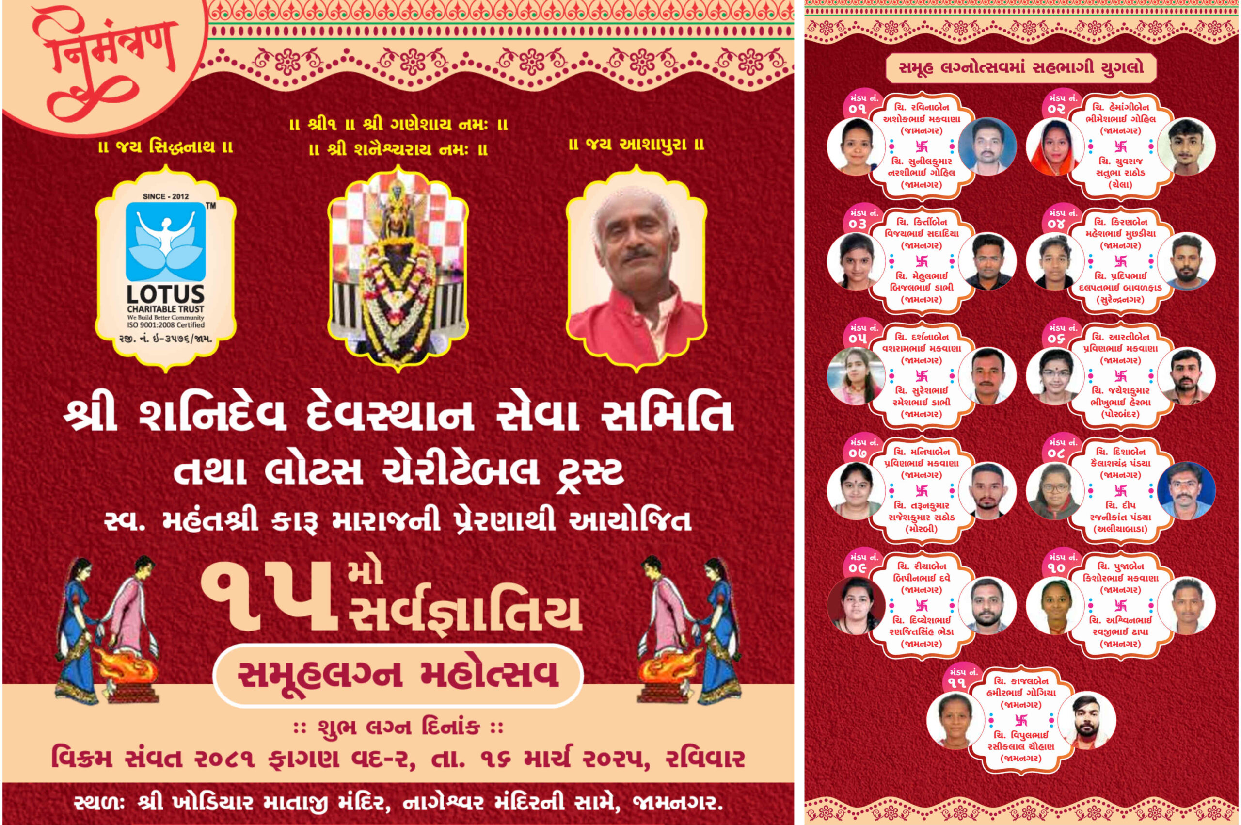 જામનગર: જામનગરમાં આવતીકાલે, ૧૬ માર્ચ, ૨૦૨૫ (રવિવાર)ના રોજ, શ્રી ખોડિયાર માતાજી મંદિર, નાગેશ્વર મંદિરની સામે, ૧૧ દીકરીઓનો ભવ્ય સમૂહ લગ્નોત્સવ યોજાશે. શ્રી શનિદેવ દેવસ્થાન સેવા સમિતિ તથા લોટસ ચેરીટેબલ ટ્રસ્ટ દ્વારા સ્વ. મહંતશ્રી કારૂ મહારાજની પ્રેરણાથી આ ૧૫ સર્વજ્ઞાતિય સમૂહ લગ્ન મહોત્સવનું આયોજન કરવામાં આવ્યું છે.