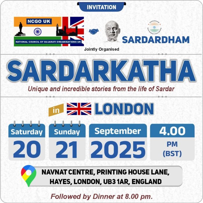 લંડન: ભારતના લોહ પુરુષ અને દેશના પ્રથમ ગૃહમંત્રી સરદાર વલ્લભભાઈ પટેલની જન્મજયંતિનું આ સાર્ધ શતાબ્દી એટલે કે ૧૫૦મું વર્ષ છે. રાષ્ટ્ર નિર્માણમાં તેમના અમૂલ્ય યોગદાનને યાદ કરવા અને તેમની વિરાસતને નવી પેઢી સુધી પહોંચાડવા માટે લંડન ખાતે એક અનોખા કાર્યક્રમ, “સરદારકથા”નું આયોજન કરવામાં આવ્યું છે. નેશનલ કાઉન્સિલ ઑફ ગુજરાતી ઓર્ગેનાઈઝેશન્સ યુકે (NCGO UK) અને સરદારધામના સંયુક્ત ઉપક્રમે આ બે દિવસીય ભવ્ય કાર્યક્રમ આવતીકાલે એટલે કે ૨૦ અને ૨૧ સપ્ટેમ્બર, ૨૦૨૫ના રોજ યોજાશે.આ વિશિષ્ટ કાર્યક્રમનું આયોજન લંડનના Navnat Centre, Printing House Lane, Hayes, UB3 1AR, England ખાતે કરવામાં આવ્યું છે. કાર્યક્રમ બંને દિવસ સાંજે ૪:૦૦ કલાકે (BST) શરૂ થશે. “સરદારકથા”ના મુખ્ય વક્તા તરીકે પૂર્વ ક્લાસ-૧ અધિકારી અને સુપ્રસિદ્ધ મોટીવેશનલ સ્પીકર શૈલેષ સગપરિયા રહેશે. તેઓ “Unique and Incredible Stories from the Life of Sardar” વિષય અંતર્ગત સરદાર સાહેબના જીવનના અનોખા અને અદ્ભુત પ્રસંગો રજૂ કરશે.